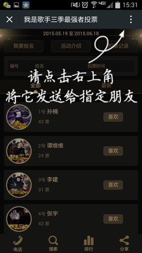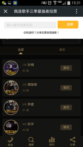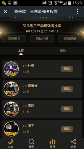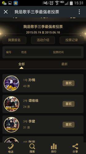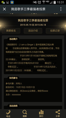 使用技巧:界面完全支持自定义,实时数据显示(参与选手,累计投票,访问量等),电话可直接跳转到拨号界面,选手报名参赛后后台可审核,搜索可以直接输入关键词搜索,排行版也是实时按投票数显示!