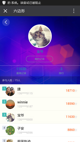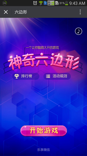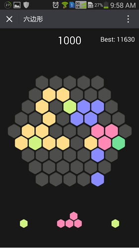 游戏主界面是一个大六边形棋盘,玩家拖动随机出现的六边形组合置于大六边形的空白处,使之排列成完整的一行或多行并且消除得分,当棋盘上再也无法摆下任意一个六边形组合的时候,游戏就会GAME OVER。颇具挑战性的消除玩法让让人停不下来,而且互相晒高分也不失为杀时间的利器。