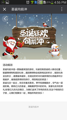 圣诞向前冲是一款躲避类型的游戏,玩家控制圣诞老人移动位置,躲避障碍物和接到礼物,遇到障碍物会扣除相应的积分,接到礼物会加积分,速度越来越快,在规定的时间内谁获得的礼物越多积分就越多,谁就能获得好的排行,得到相应的奖品!