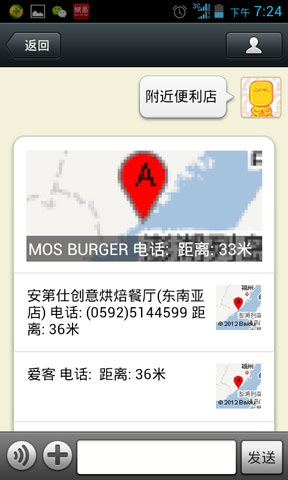 开启此功能,直接发送地理位置信息,然后输入“附近便利店”