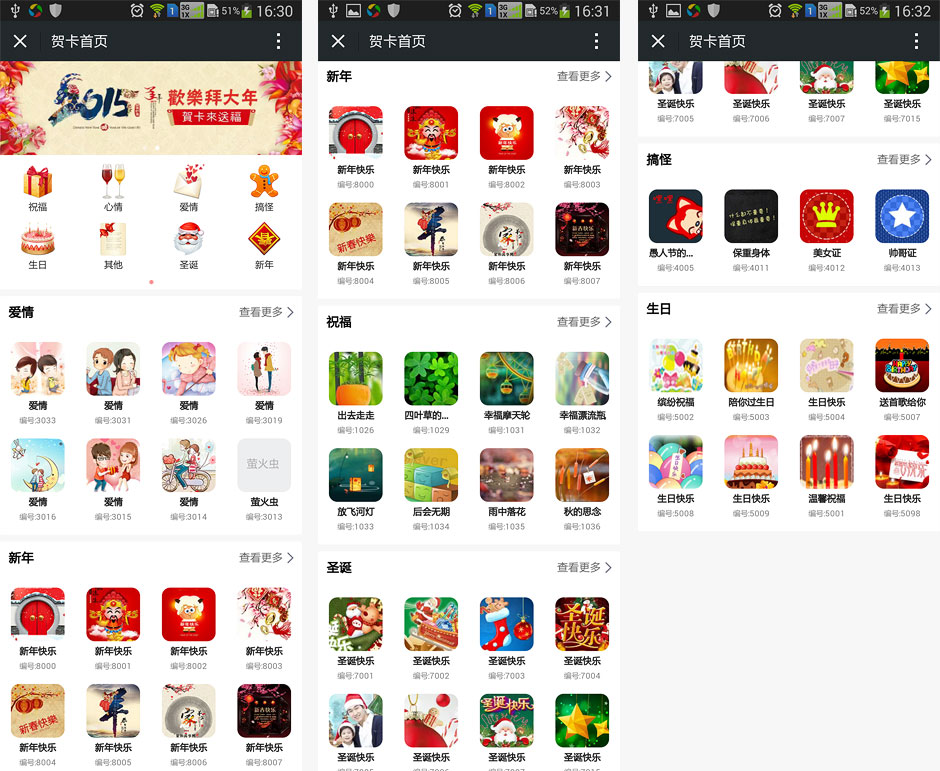 功能亮点:节日祝福,心情,爱情,搞怪,生日,圣诞,新年等所有节日,所有类型的贺卡都应有尽有,精美的壁纸美不胜收,多样的种类选择肯定有你称心如意的一个。